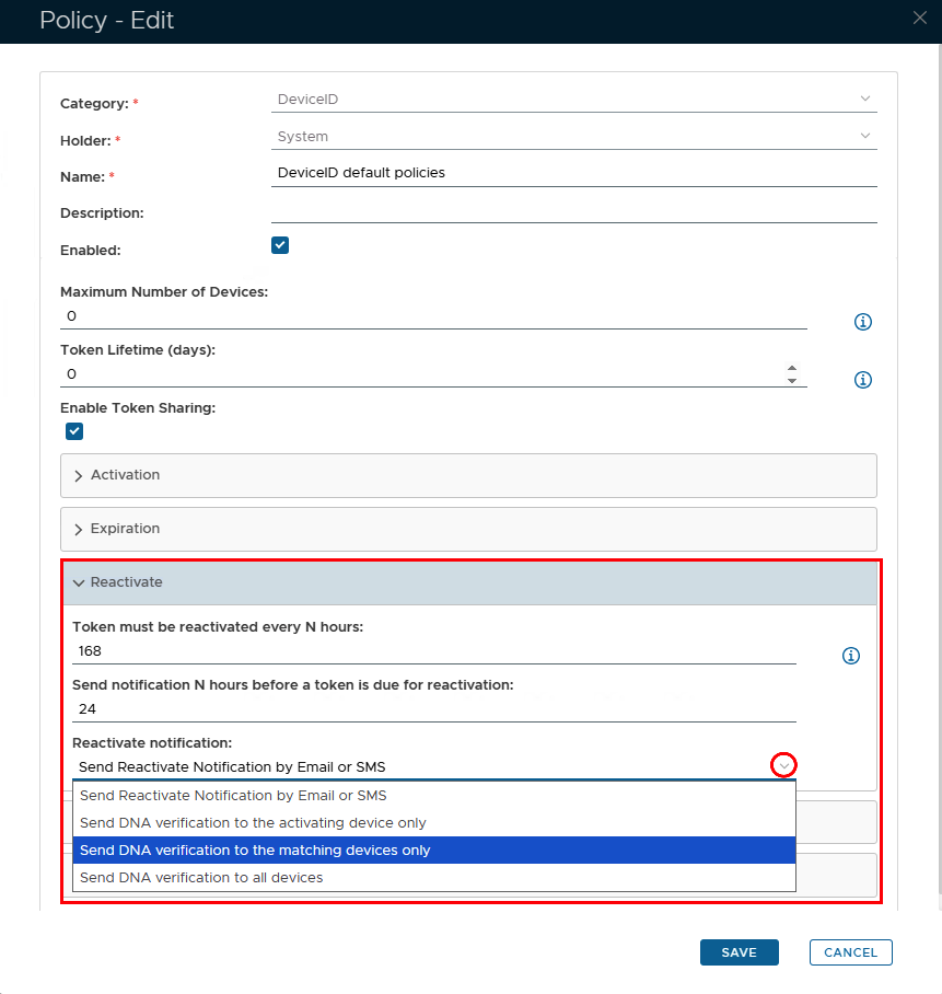 The notifications that are sent are based on the parameters specified in the DeviceID policy setting parameters in the "Reactivate" section of the policy (see below);