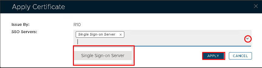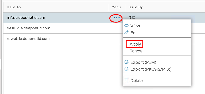 Click on the ellipses corresponding to the newly imported Server Certificate and select Apply