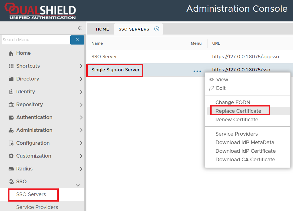 Navigate to "SSO | SSO Servers", click the context menu of "Single Sign-On Server"