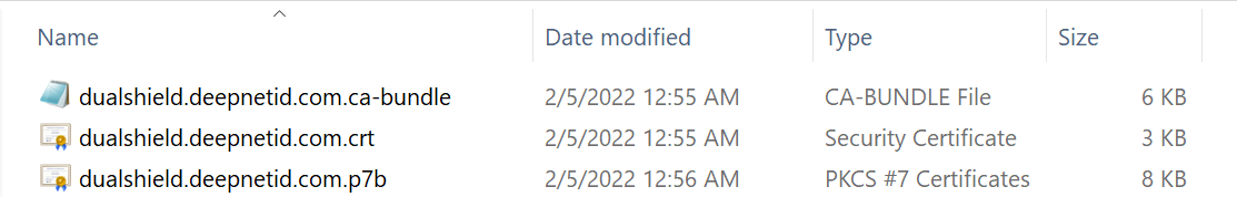 Also, a CA bundle file will be provided. The CA bundle file includes the certificate of the root CA and the intermediate CA, e.g. "dualshield.deepnetid.com.ca-bundle"