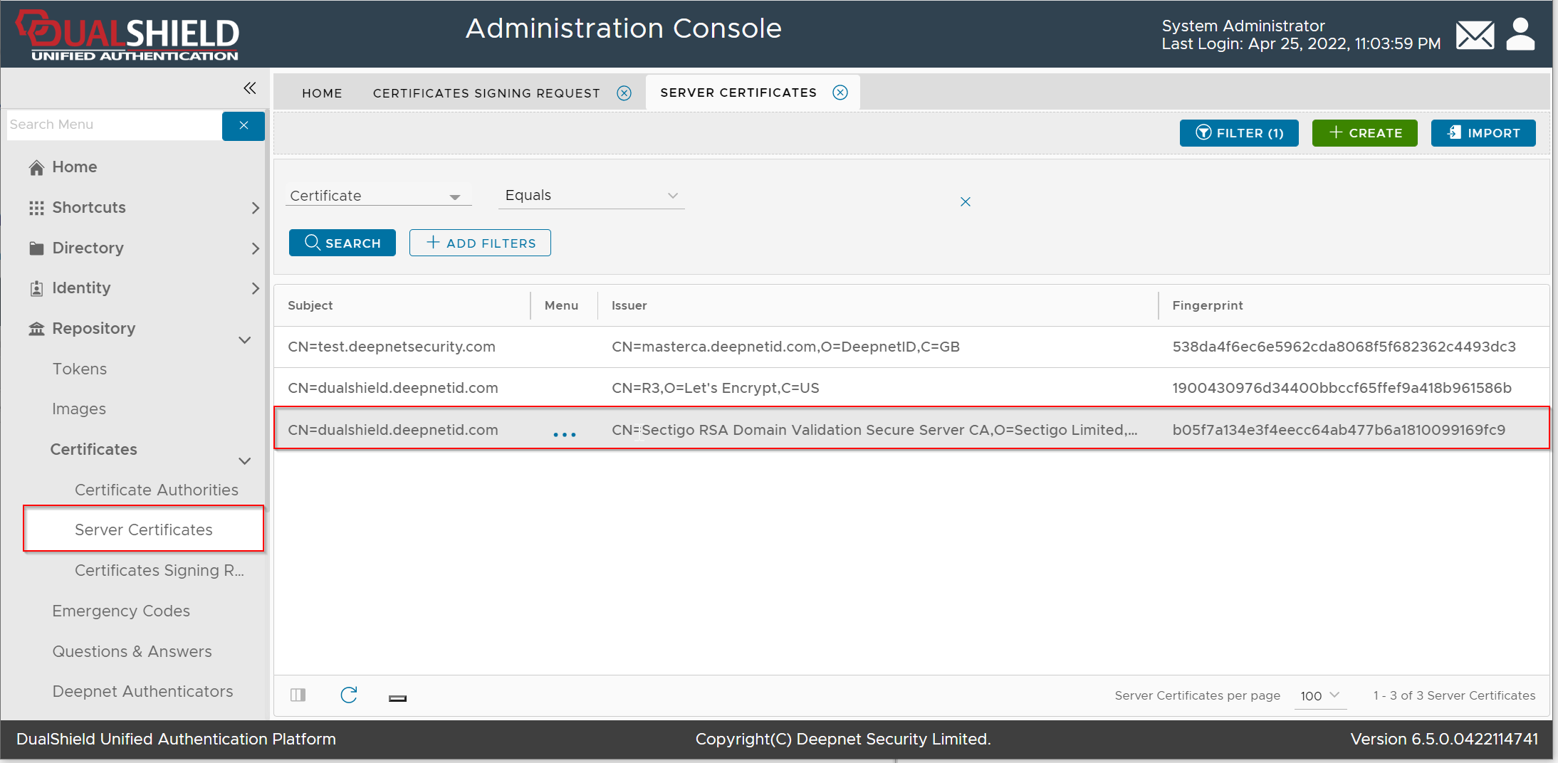 If you have got an existing SSL certificate in a PFX file, then you can import it into the DualShield server to be used as a server or web SSL certificate.