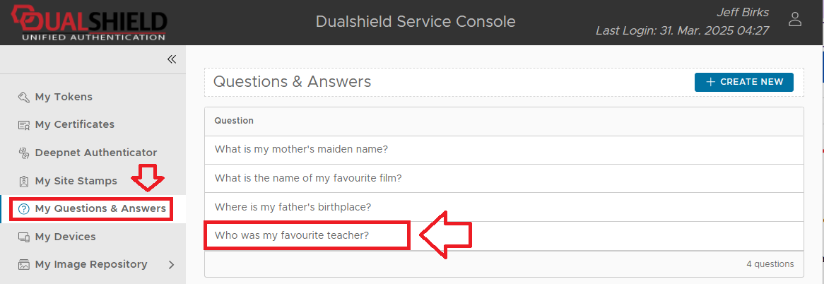 Question and Answer pairs may be created either by using using the management console, or by the user themselves (after accessing the DualShield Service Console).
