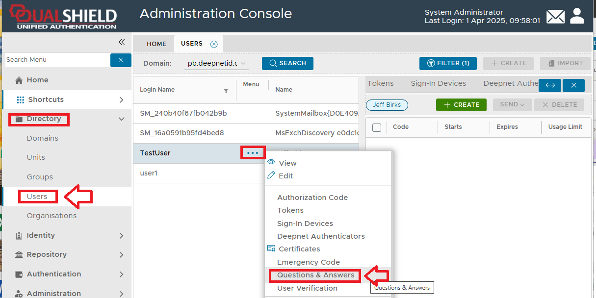 Navigate to "Directory | Users", select the domain, search for the user to issue the code to, then selecting the context menu option "Questions & Answers";
