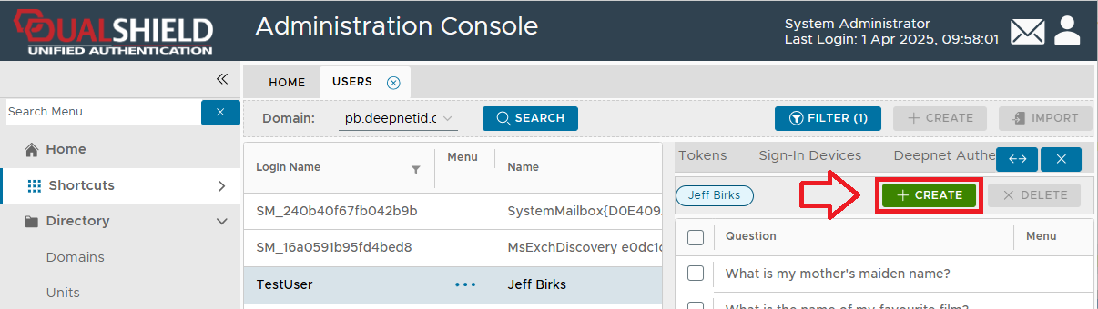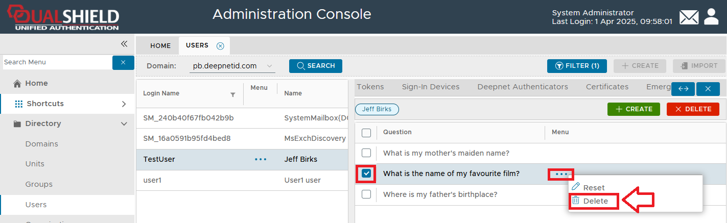 • Question and Answer pairs can be created for users from the Management Console by navigating to "Directory | Users", left clicking on the context menu for the required user, then selecting the option "Questions & Answers";