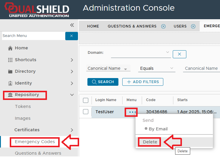 Deleting Emergency Codes directly from the Emergency Code Repository
