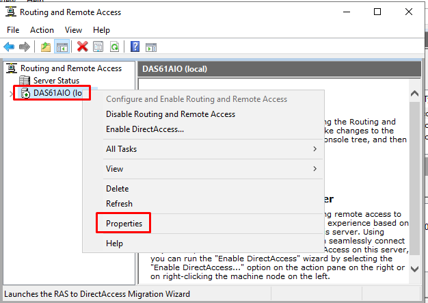 3. Right Click on the server and select "Properties"
