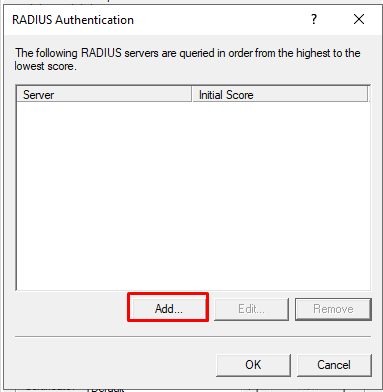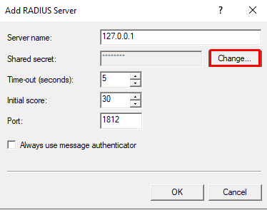 5.  Add a new RADIUS server.  Set the Server Name as the IP address of the NPS. If NPS is installed on the same machine set the server name as the local IP address. Also, specify the shared secret by clicking on Change