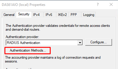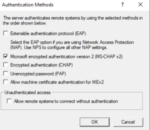 7.  Select the authentcation methods you wish to use, e.g. MS-CHAP v2