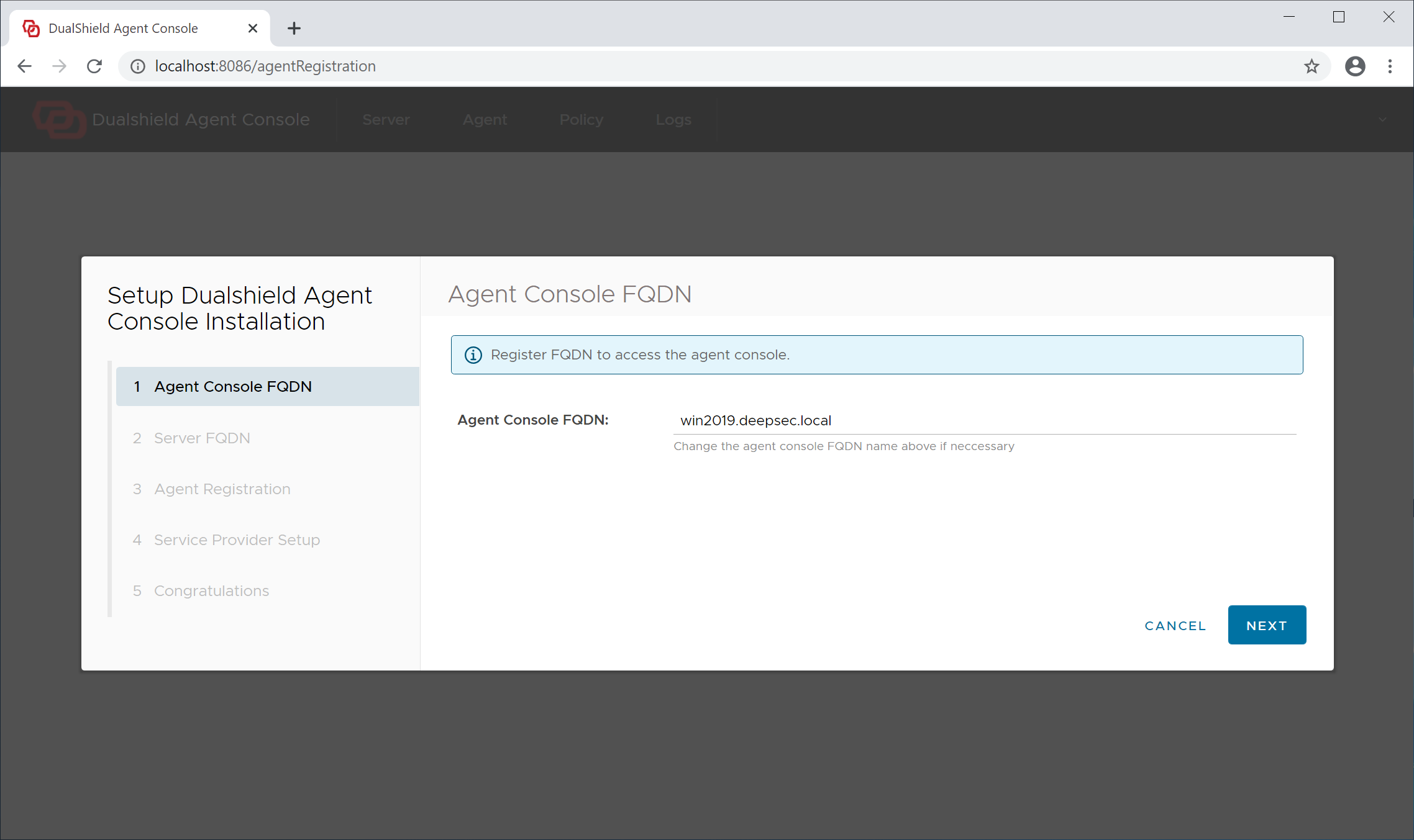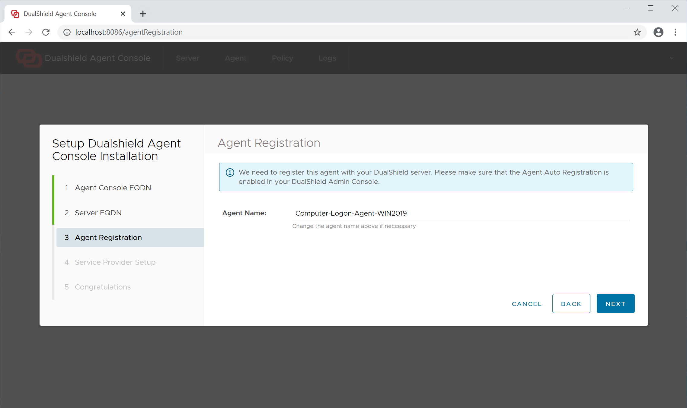 The admin console of the Logon Agent is a web portal, therefore it needs to have a hostname, or fully qualified domain name (FQDN). By default, the full computer name is suggested as the Agent's hostname.