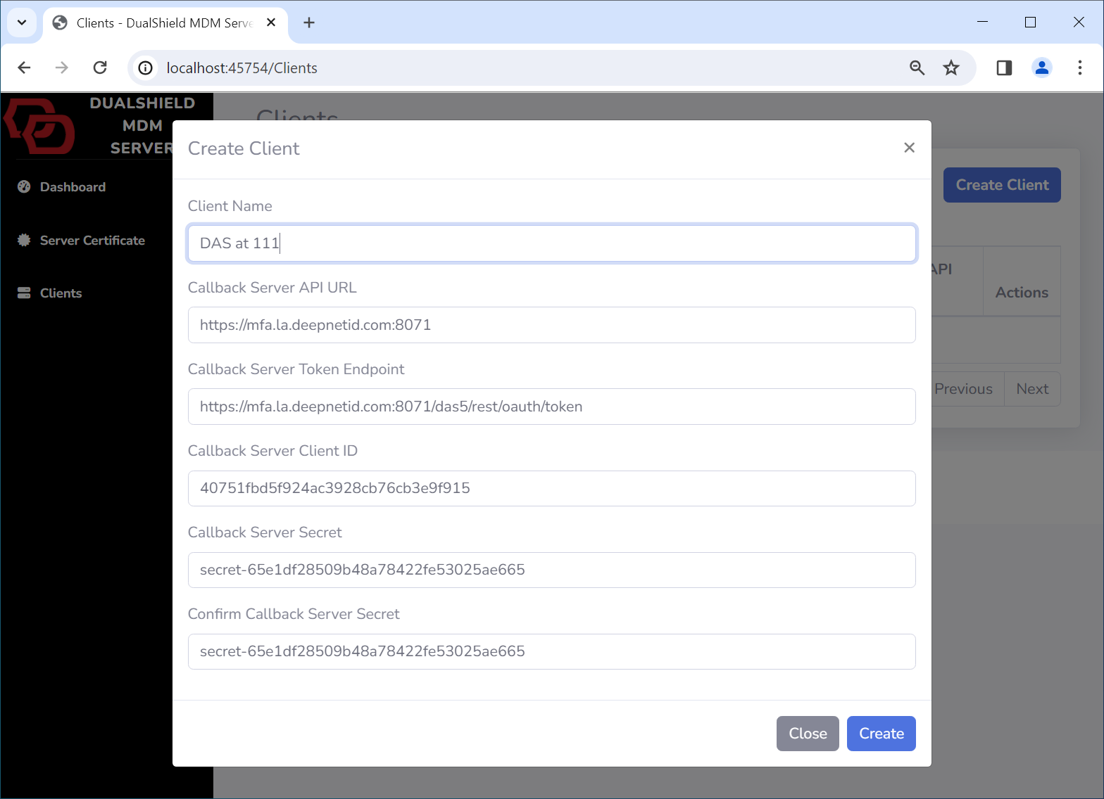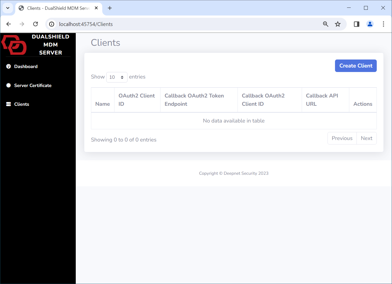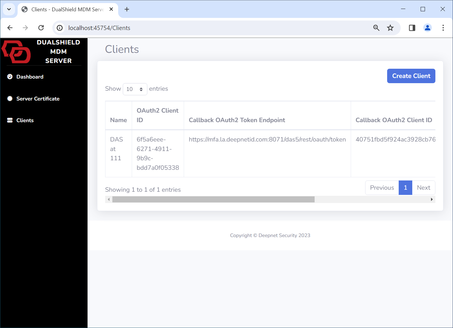 In the Admin Console of the DualShield MDM Server, navigate to Clients