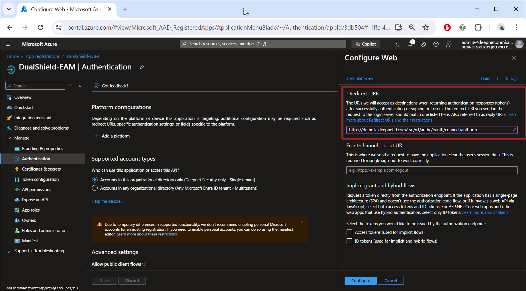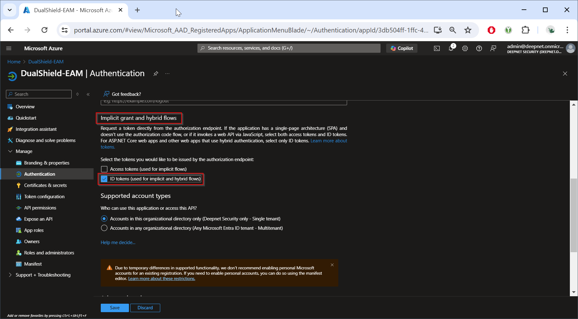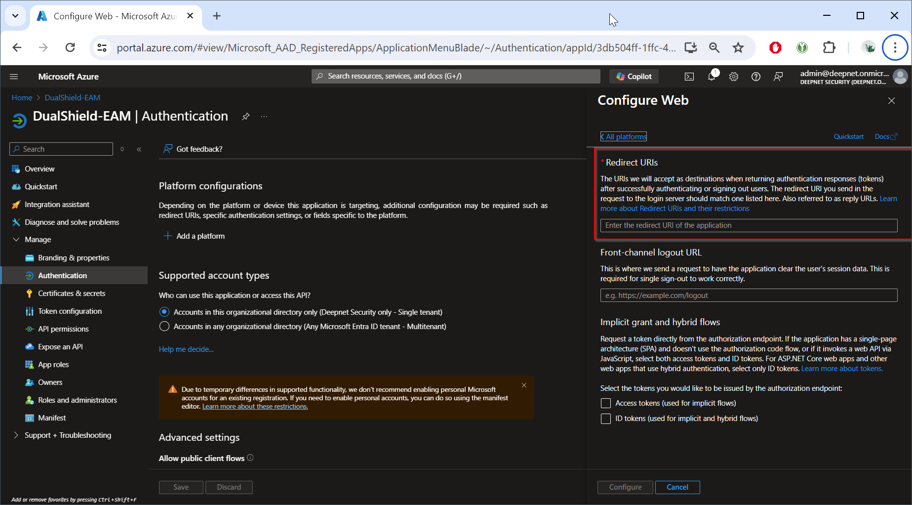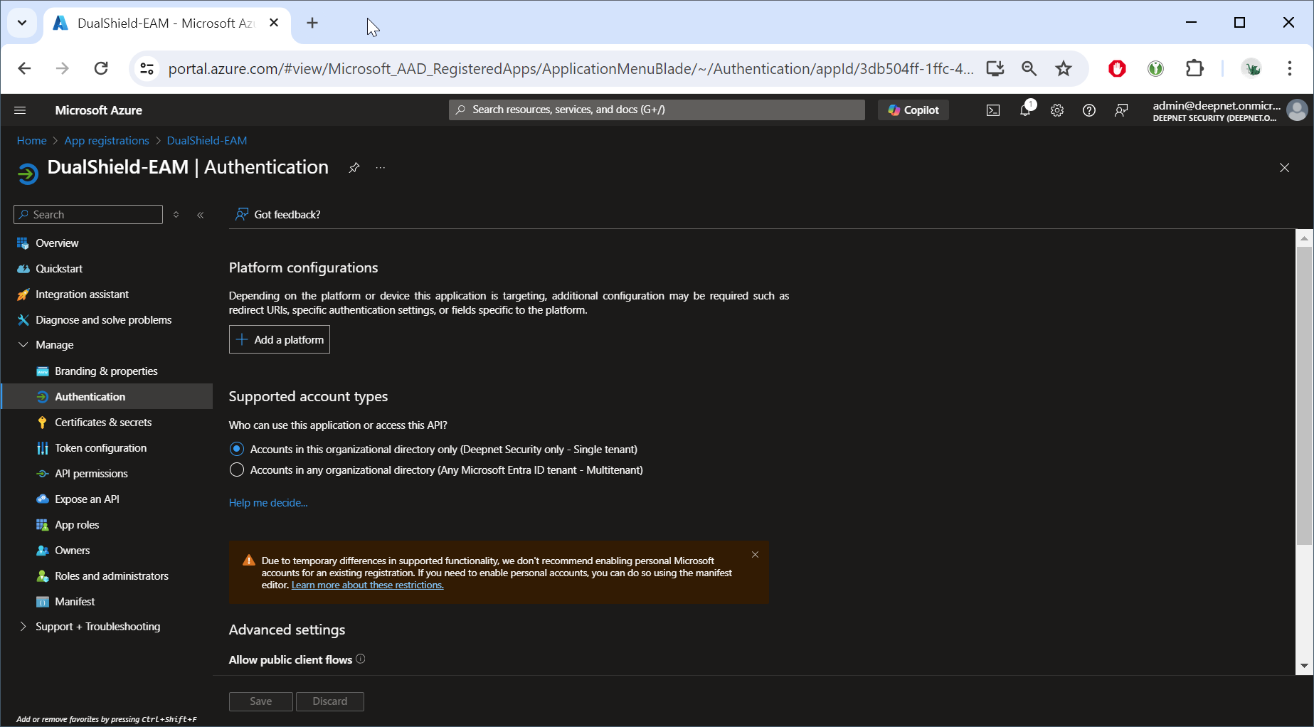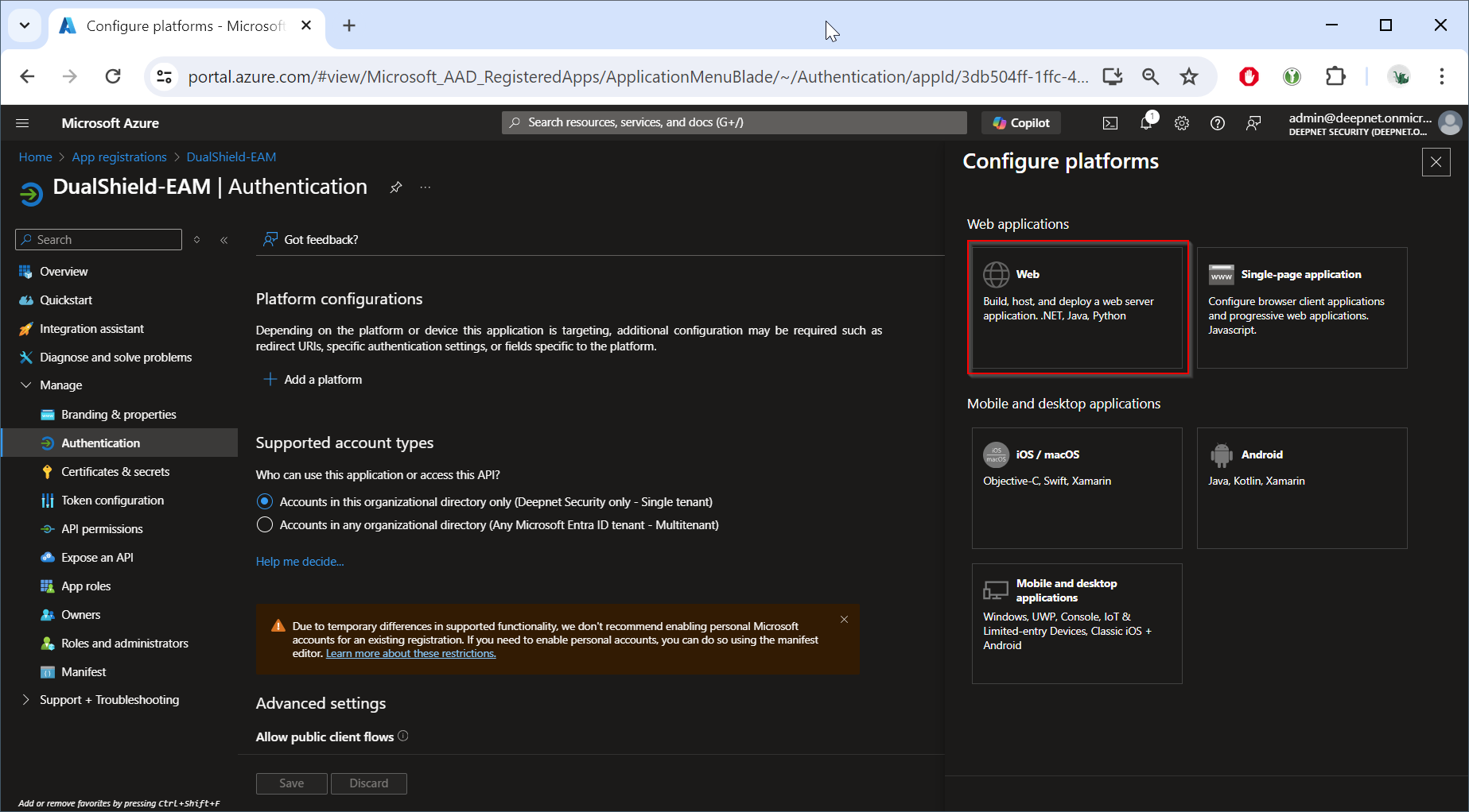 Sign in to Entra ID, navigate to "App registrations", register a new application, e.g. "DualShield-EAM"