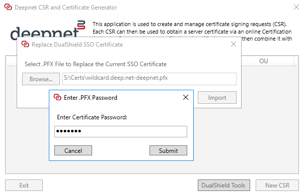 To Replace the DualShield SSO Server Certificate, you will need to download the Deepnet CSR & Certificate Generator. To use the tool, you will need to run it on your DualShield server.