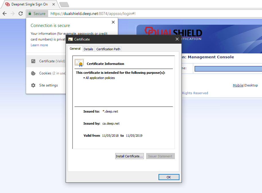 When you restart the DualShield server and access it via the web browser, you should see the new certificate in use.