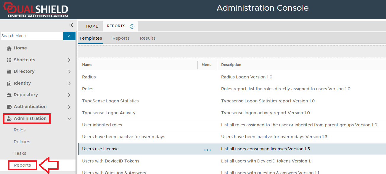 To create a report, navigate to "Administration | Reports", then select the tab "Templates";