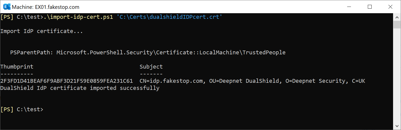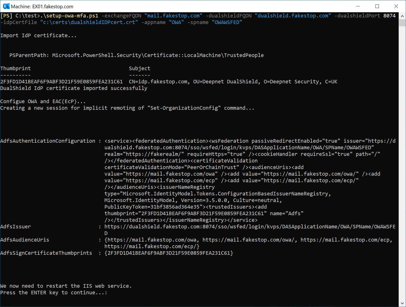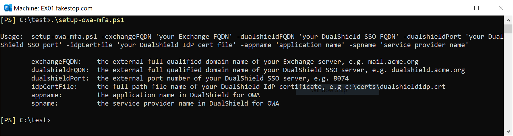 ./setup-owa-mfa.ps1 -exchangeFQDN 'your Exchange FQDN' -dualshieldFQDN 'your DualShield SSO FQDN' -dualshieldPort 'your DualShield SSO Port' -idpCertFile 'your DualShield IdP cert file' -appname 'application name' -spname 'service provider name' |
