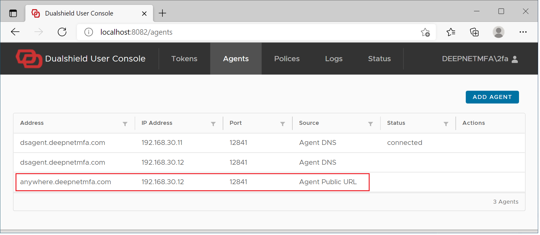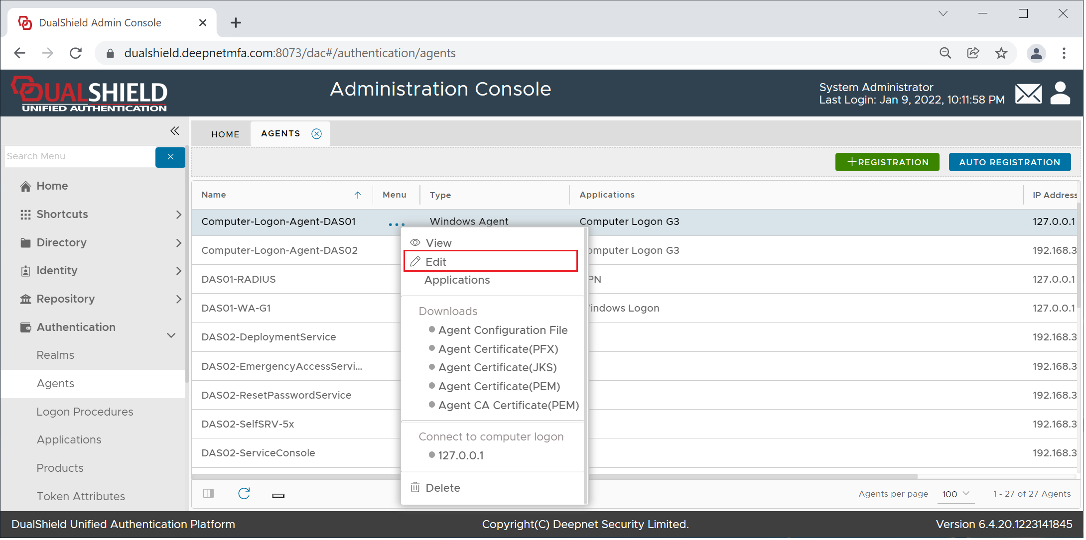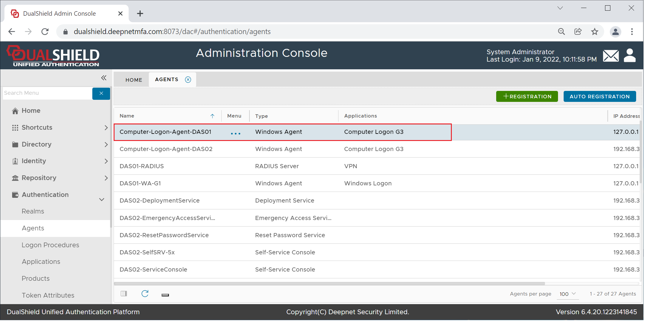 In the DualShield Admin Console, find the computer logon agent in Authentication | Agents