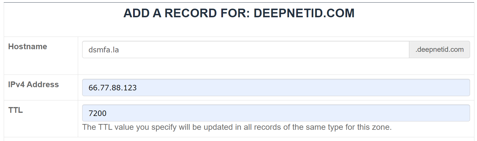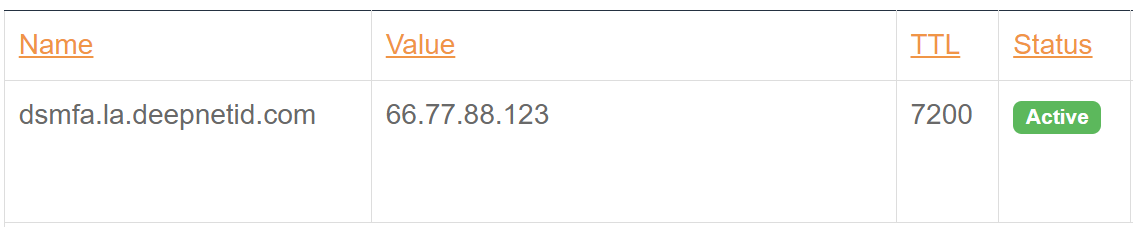 The example below created an A record with the hostname "dsmfa" in the domain "la.deepnetid.com"
