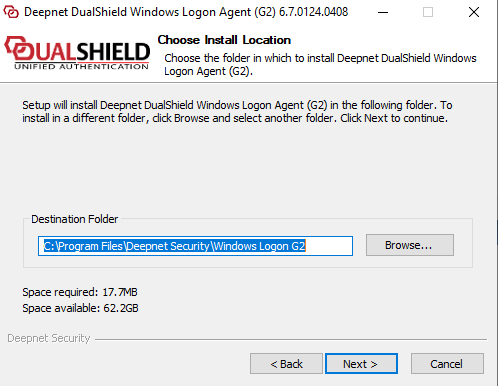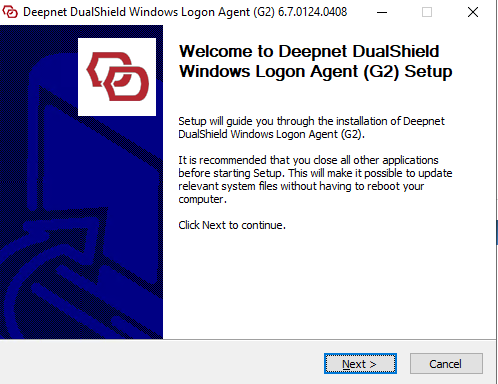 To install the DualShield Windows Logon Agent, launch the installer SetupDSAgent-xxx.yyyy.exe (where xxx is the version number and yyyy the build number) and go through the following steps: