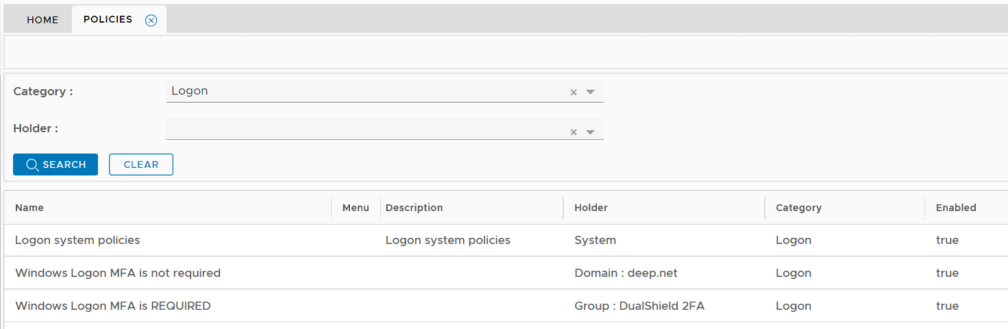 - From the Home page of the Management Console, left click on the menu item "Administration", select "Policies", then in the new tab "POLICIES", select the category "Logon", then click the