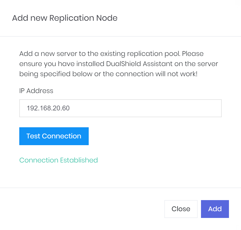 To create or modify a replication cluster, start by clicking the Add Server button. You will be presented with a dialog to input the new server's IP address and connect to the DualShield Assistant instance on that server. Once connected, you will see a confirmation message and can then add the server into the management list.