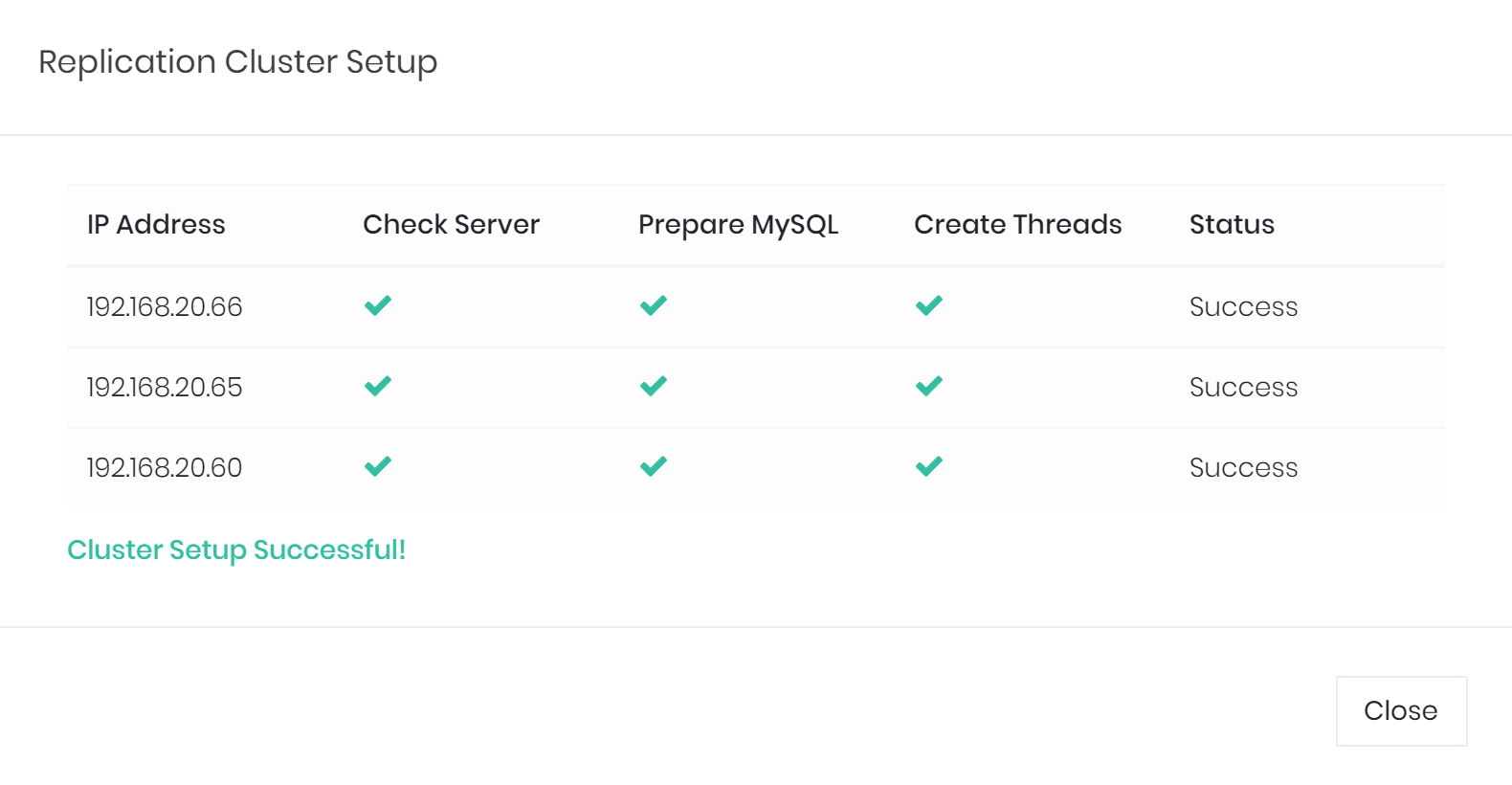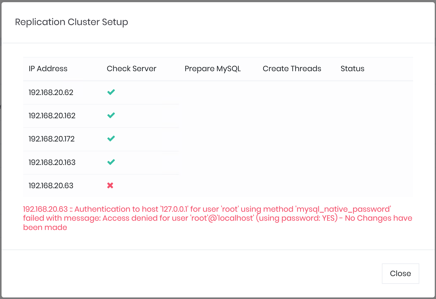 The server will be added to the list of servers only temporarily. Next you need to click the Modify Cluster button. This will bring up a new dialog window where you can start the replication cluster modification process and monitor the status of the operation. Click the Execute Changes button to start the cluster setup operation.