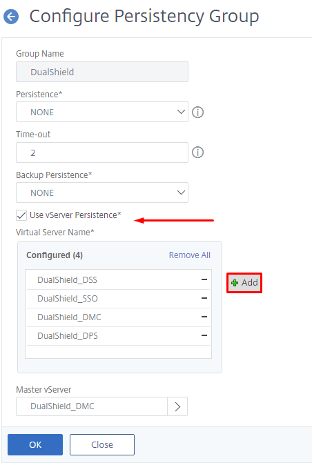 Enter "Name",  enable "Use vServer Persistence" and add all the virtual servers we have created.