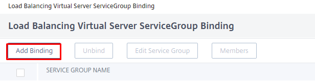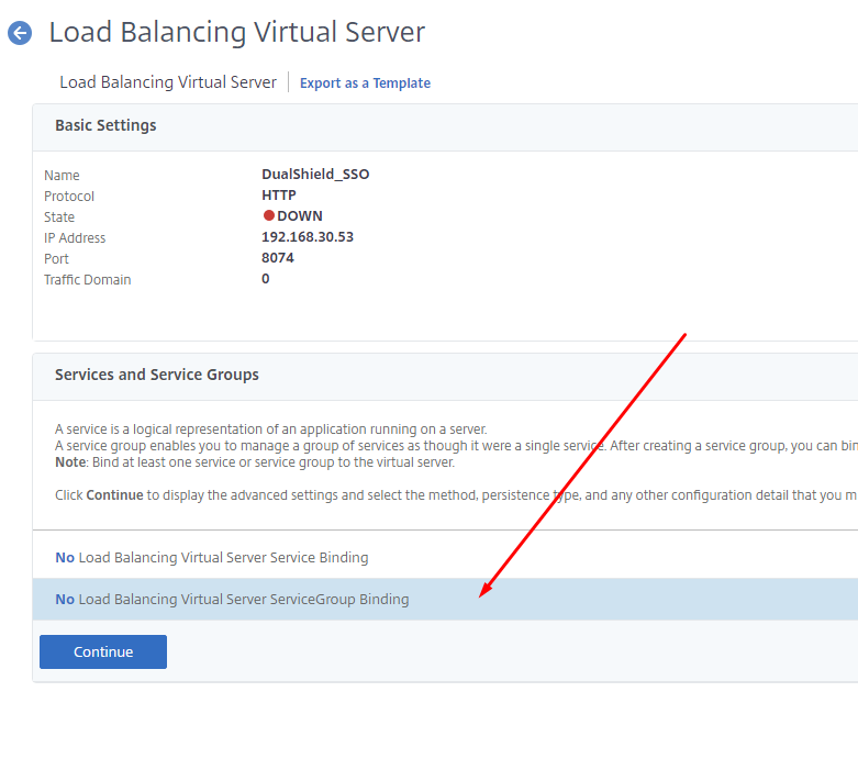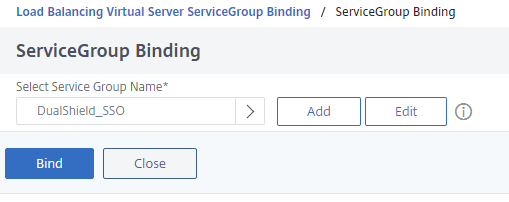 Now, we need to bind the newly created virtual server to a service group. In this example, we'll bind this virtual server to the DSS service group:
