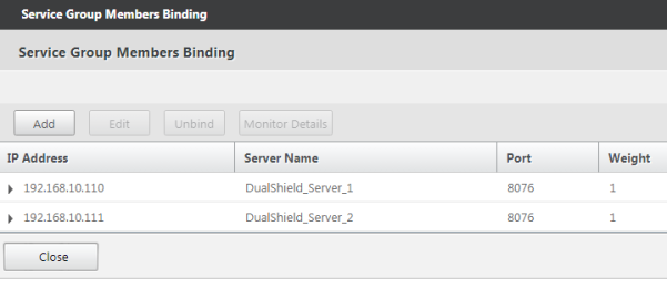 Now, we have create a service group called "DualShield_DSS" for the DualShield Self-Service Console. This group includes 2 real servers: "DualShield-Server_1" and "DualShield-Server_2"