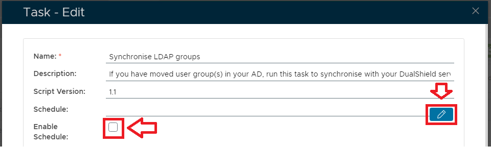 Select the "Enable Schedule" checkbox to ensure the task schedule is activated, then use the pencil icon ("") to specify the time and frequency settings for automated task execution.
