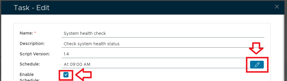 Select the "Enable Schedule" checkbox to ensure the task schedule is activated, then use the pencil icon ("") to specify the time and frequency settings for automated task execution.
