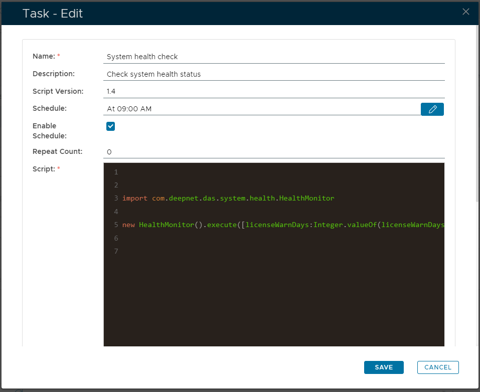 The system health check task is enabled by default, and by default is scheduled to run at 9 AM every day.