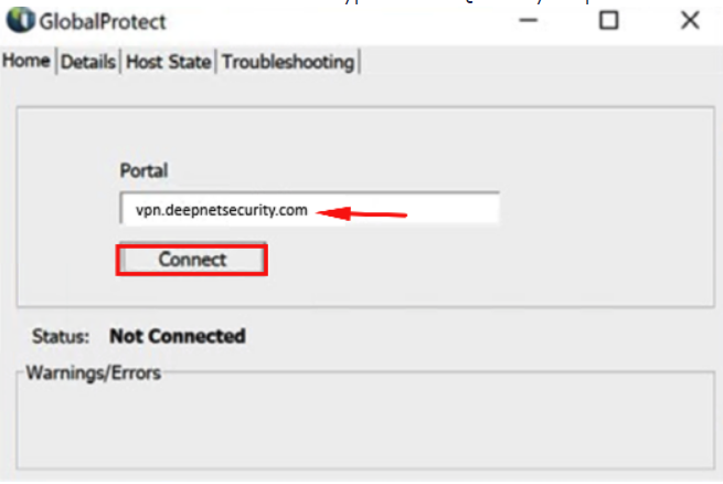 Launch the GlobalProtect Client type in the FQDN of your portal and click on Connect..