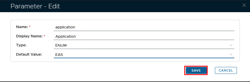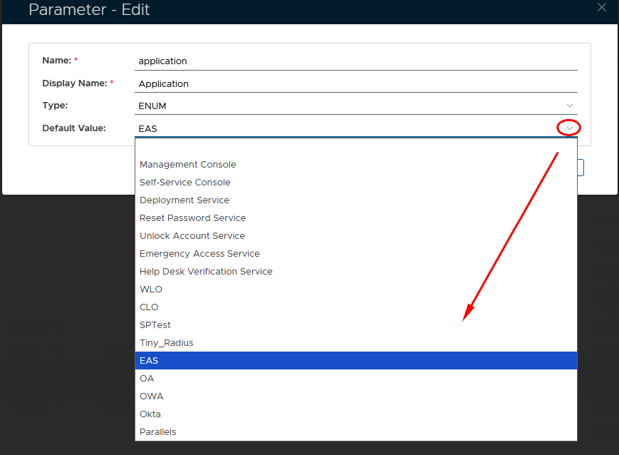 Select the parameter "application" then click thebutton, and a new window titled "Parameter - Edit" will open;