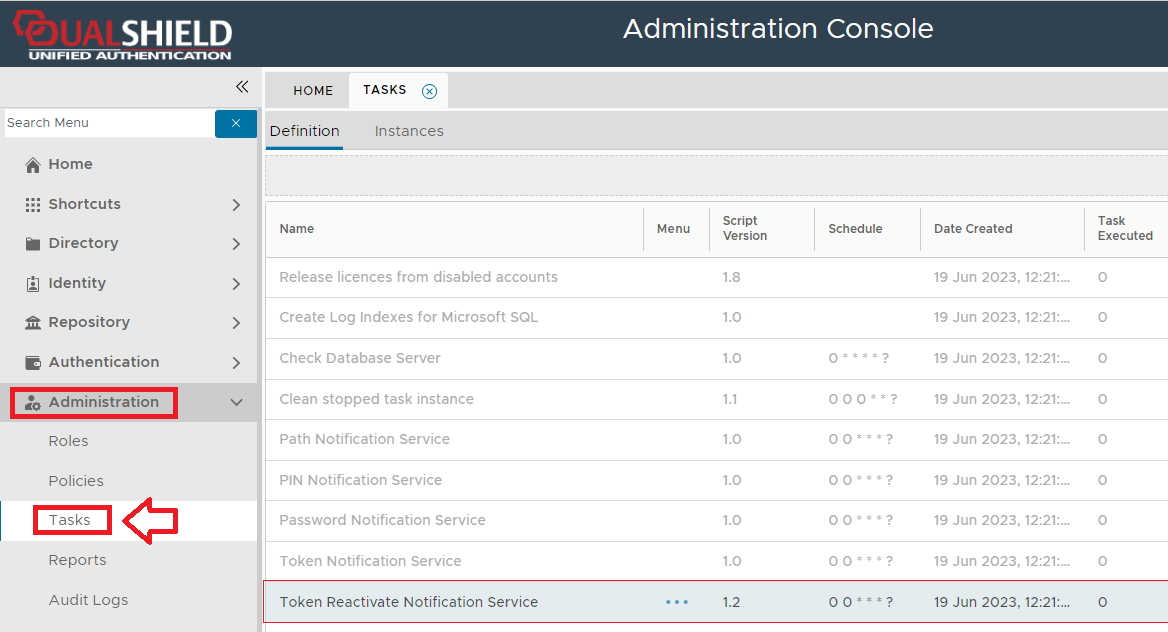 The task can be found by navigating to "Administration | Tasks", then scrolling down to the task "Token Reactivate Notification Service";