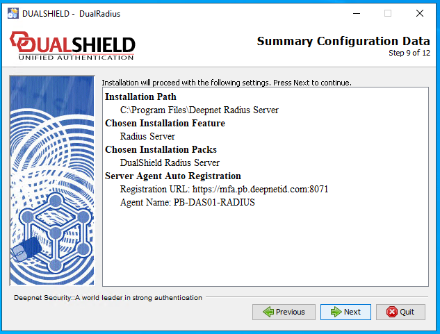 A new window titled "DUALSHIELD - DualRadius" will open welcoming you to installation of the Radius Server;