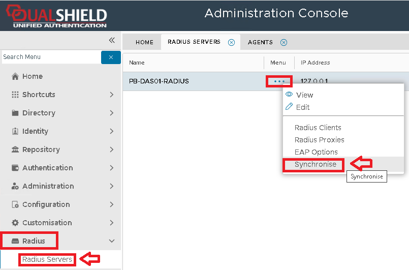 After waiting a couple of minutes for the DualRadius service to start, Log in to the management console, then navigate to "Radius | Radius Servers".
