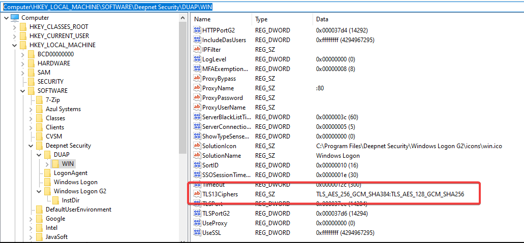 The general way for an administrator to configure is to add or remove cipher suites in the registry editor. The path to do this is "HKEY_LOCAL_MACHINE\SOFTWARE\Deepnet Security\DUAP\WIN" and configure ciphers for the REG_SZ values "TLS12Ciphers and TLS13Ciphers".