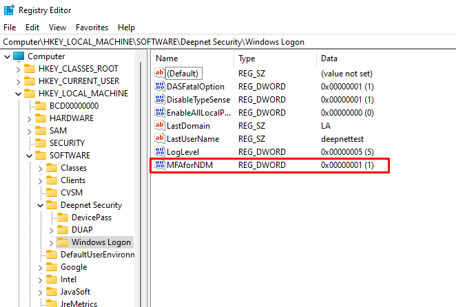 The key that needs to be changed is: Computer\HKEY_LOCAL_MACHINE\SOFTWARE\Deepnet Security\Windows Logon