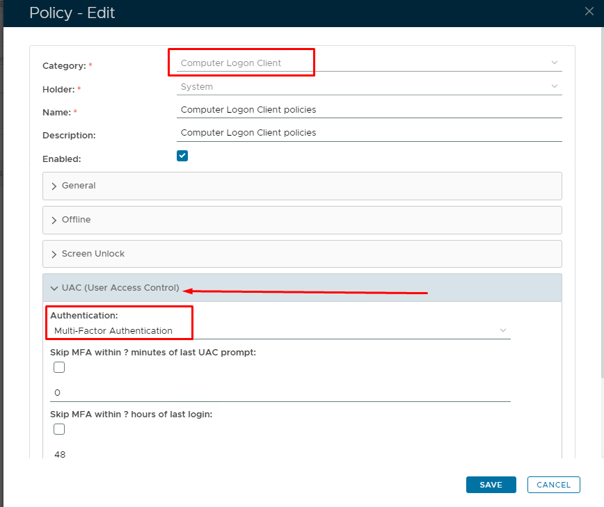 The second step required is to access the DualShield Administration Console and modify the UAC settings found within the Computer Logon Client policy. Although strictly speaking UAC does not protect network drive mappings nor are you using Computer Logon software, some of the features in this policy do apply to the behavior of Windows Logon, therefore UAC authentication must be set to Multi-Factor Authentication for this to work..