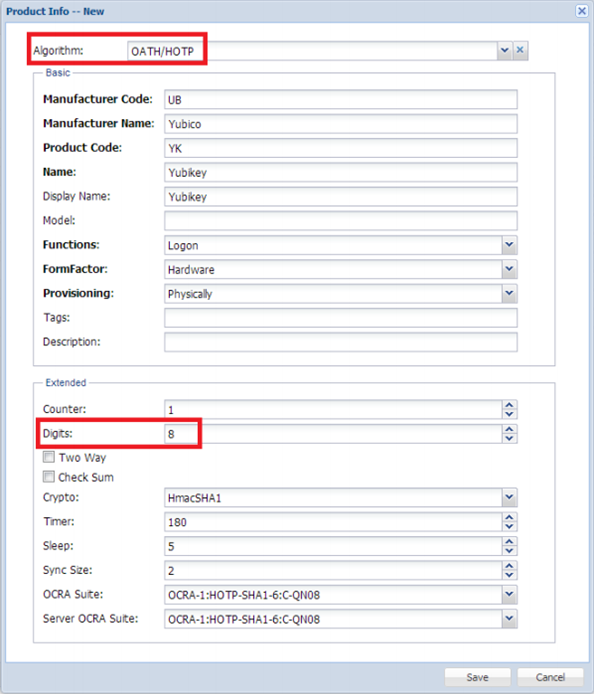 4. Complete the production creation page as below (assuming that you will configure your Yubikey to support OATH/HOTP with 8-digit display.