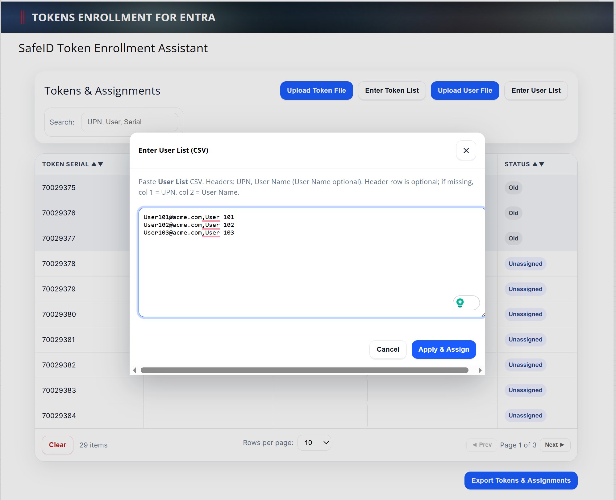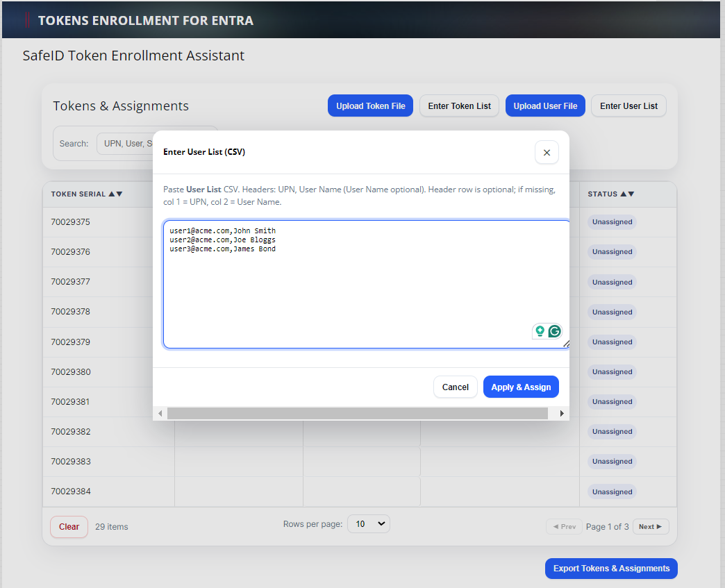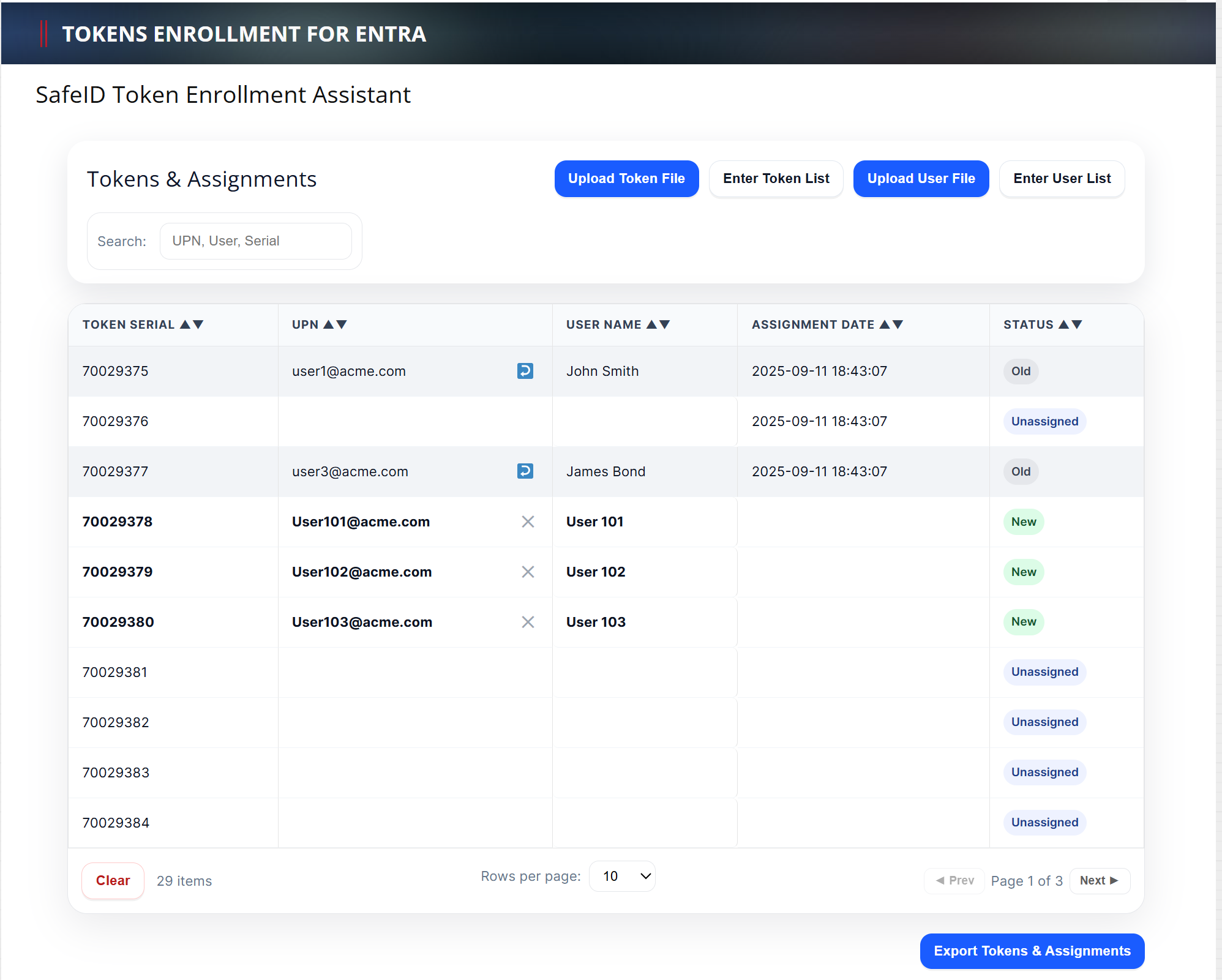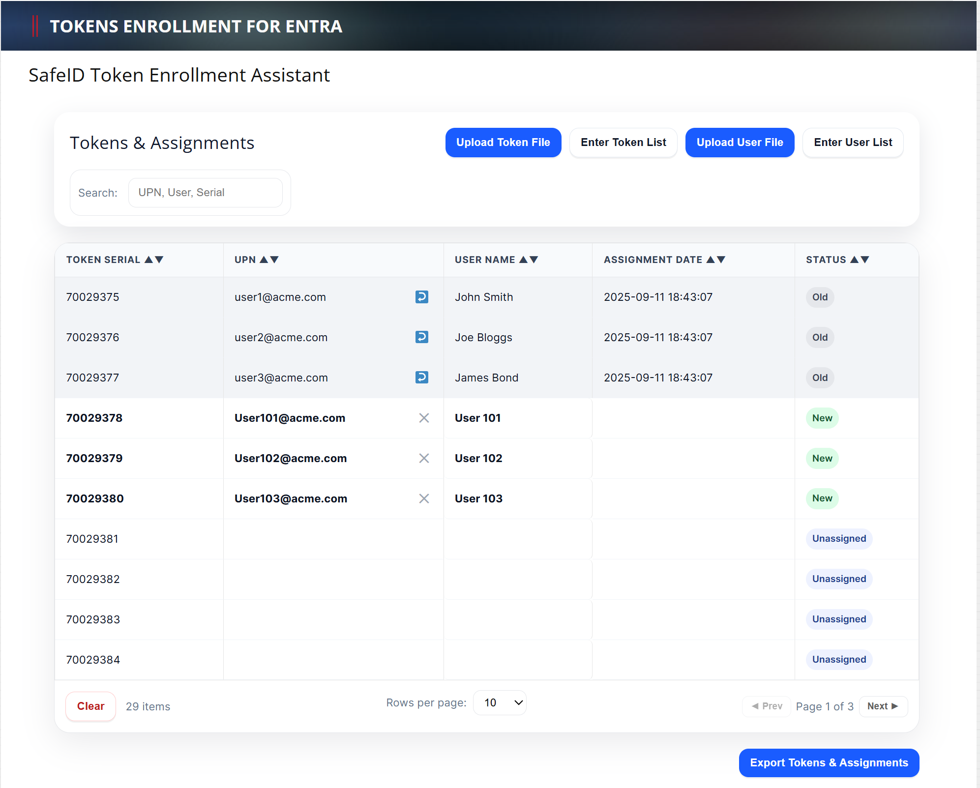 Once you have assigned tokens to users, you can upload the token assignment file onto Entra ID