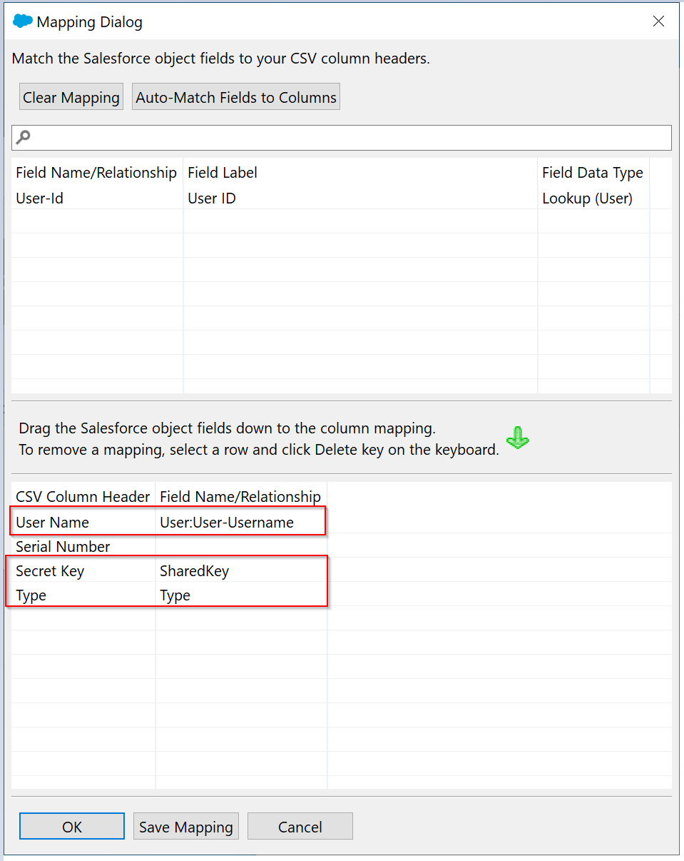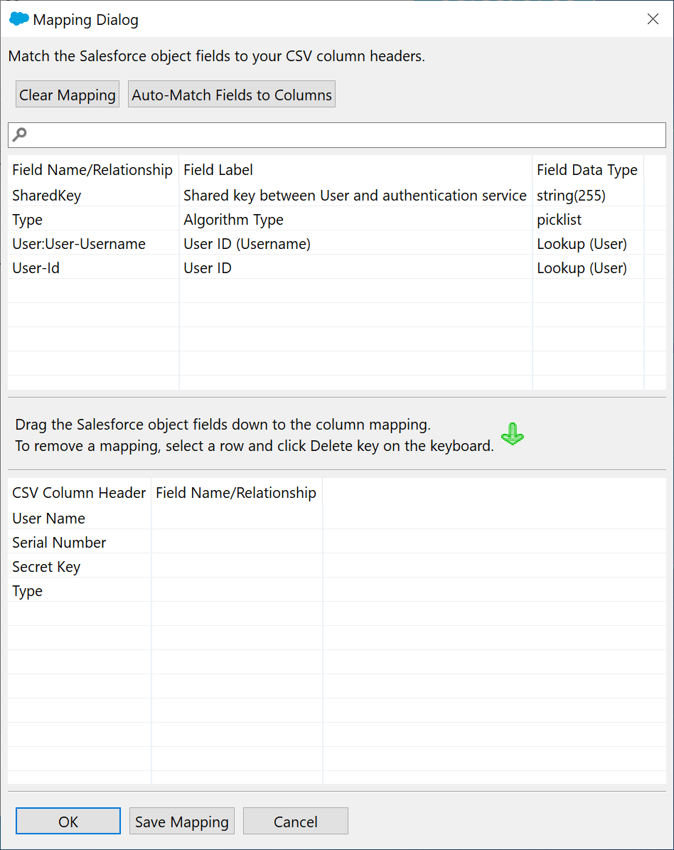Drag the Salesforce object fields down below to the CSV Column, so that the result looks the same as the one below.