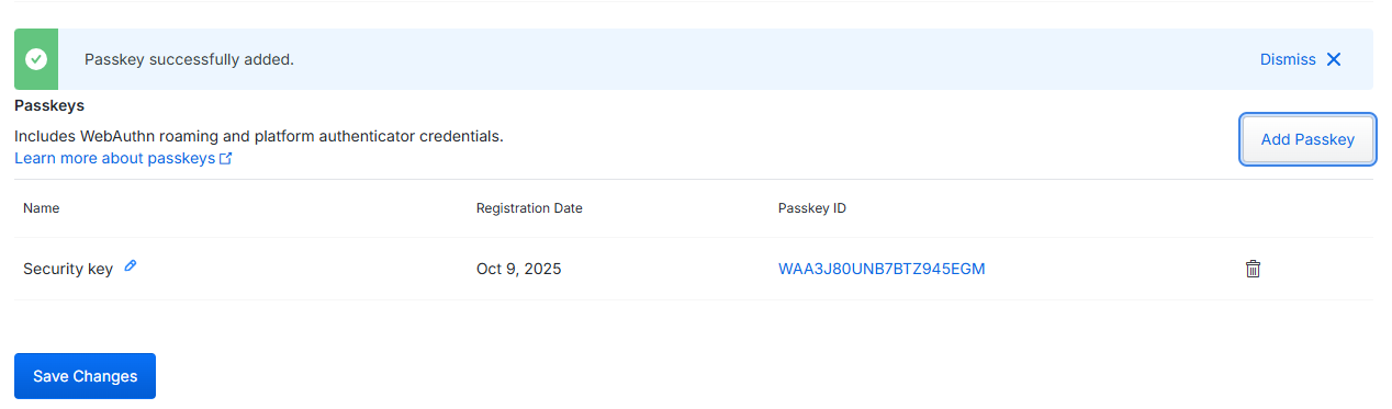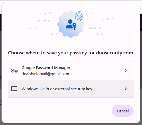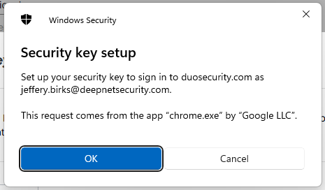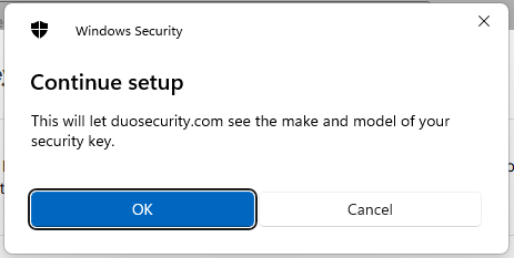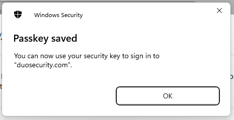 Click "OK", and the FIIDO2 key will be registered with Duo, and you will be shown confirmation that the passkey has been added;