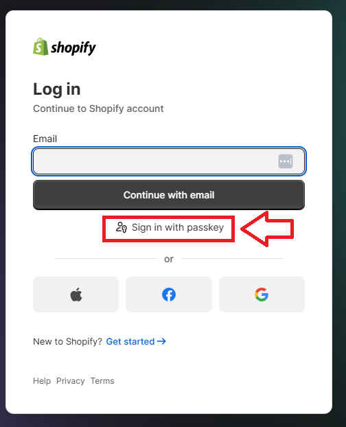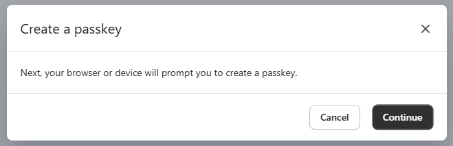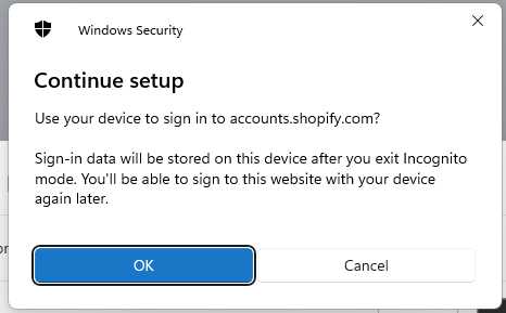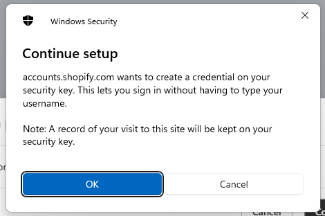 You are now ready to register a Fido2 key with Shopify, and will presented with the following screen, click