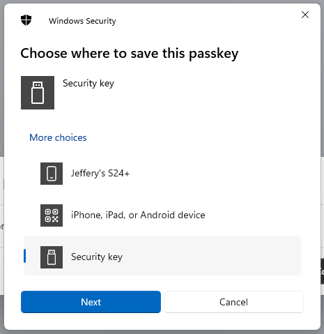 When asked where to save this passkey, select the option "Security Key", then click