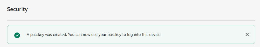 Click "OK", and the FIIDO2 key will be registered with Shopify as soon as you verify the key, and a confirmation will show that the passkey has been created;