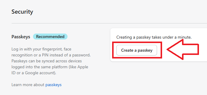 In order to add a Fido2 key as an authentication option, click on the button "Create a passkey";