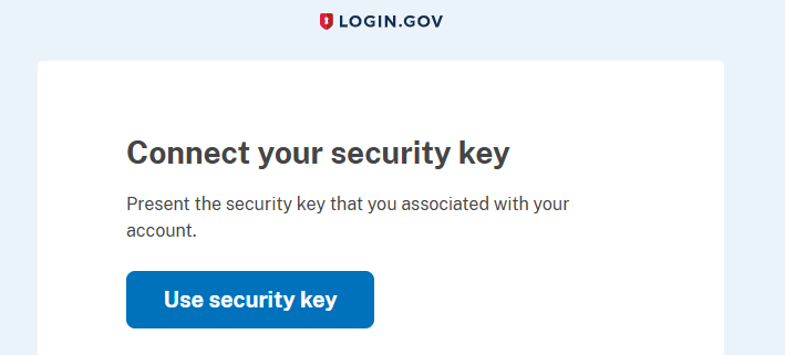 Log in to your Login.Gov account, in by supplying your email address and password, and you will then be asked to connect using your security key;.