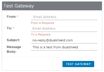 5. After entering the test gateway fields (and after ensuring that the from address is a valid email address), you can test the functionality of the gateway by clicking on the "TEST GATEWAY" button (which will produce a message indicating if the email was sent correctly);