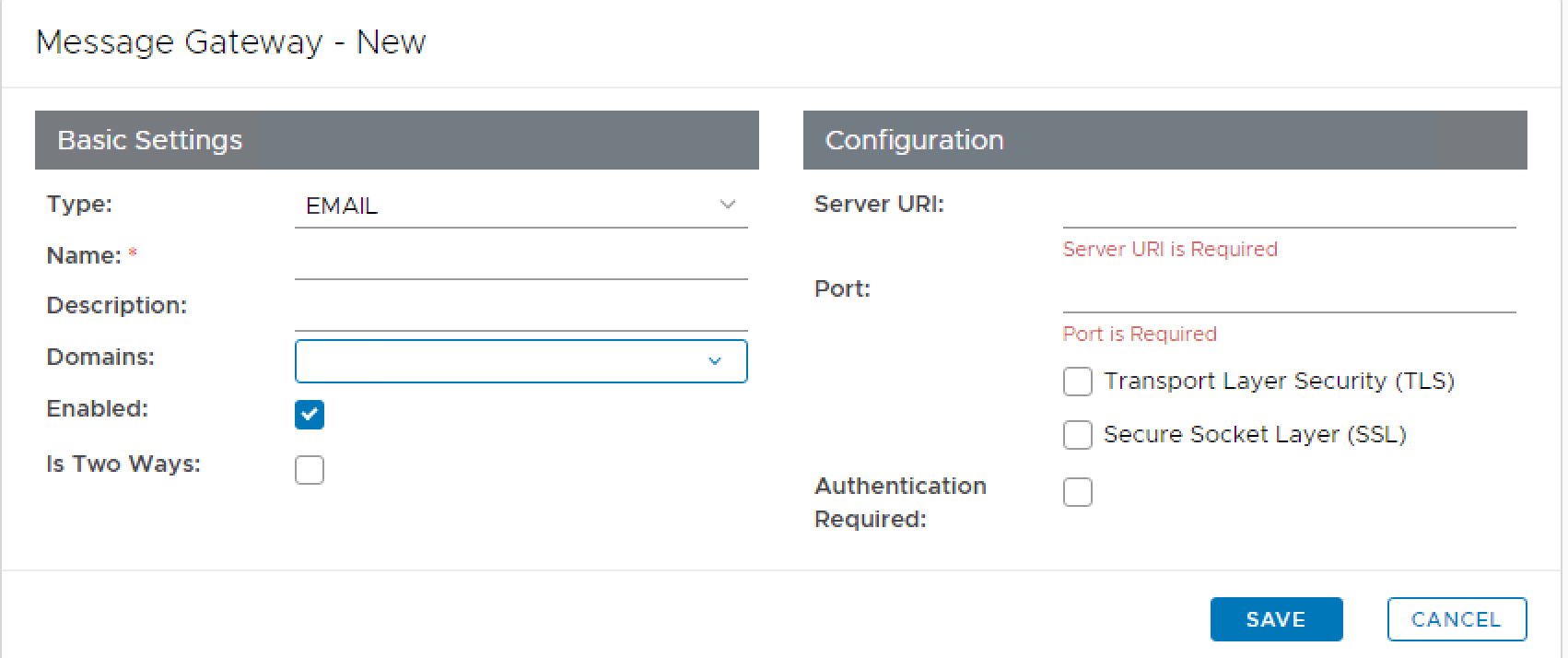 At the prompt "Type:", select "EMAIL", enter a suitable name and description for the email gateway, and select what domains will be able to use the message gateway;